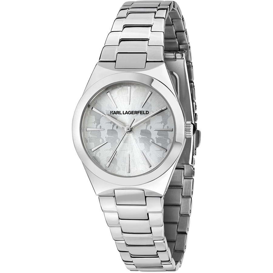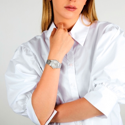 Женские кварцевые часы. Центральные часовая, минутная и секундная стрелки. Серебристый циферблат. Круглый корпус выполнен из нержавеющей стали. Диаметр корпуса составляет 30 мм, толщина 7,7 мм. Стальной браслет, раскладывающаяся застежка. Прочное минеральное стекло. Водостойкость WR 50 (мытье рук, дождь).