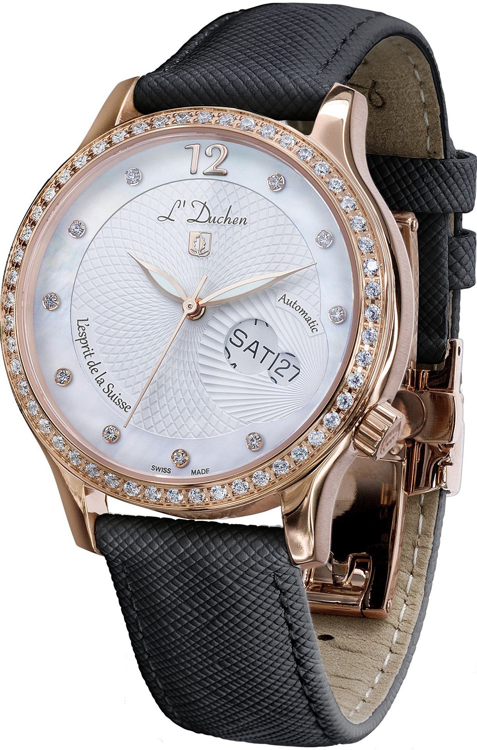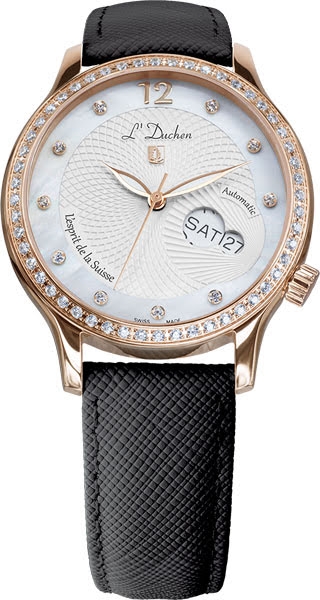На центральной части циферблата вы можете наблюдать узор, который используют ювелиры мирового уровня. Далее, обрамляя окошко даты и дня недели, рисунок гильоше, который складывается в узор морской раковины. И обрамляет это все кольцо из натурального перламутра. Корпус выполнен из нержавеющей стали 316L с PVD покрытием. Корпус и циферблат инкрустированы 60 фианитами, каждый камень закреплен в кастах. Рельефная заводная головка смещена не случайно, таким образом уменьшается ее соприкосновение с запястьем. Ремень из натуральной кожи с сафьяновым тиснением оснащен застежкой "бабочка" с кнопками.