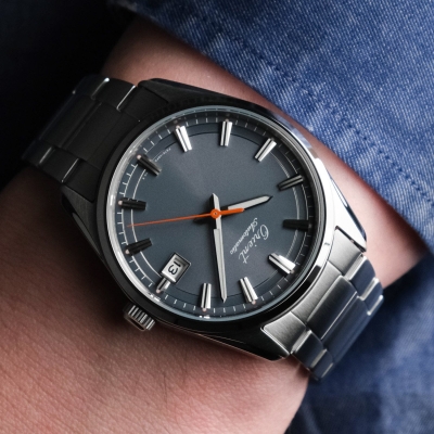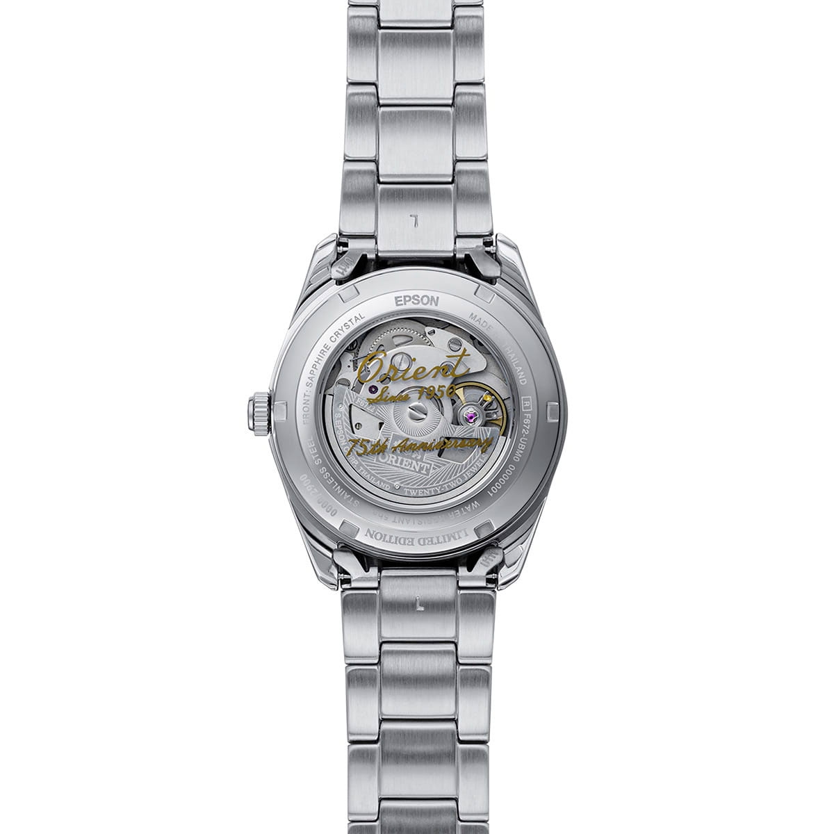 Stretto 75th Anniversary. Лимитированная серия — 2900 экземпляров. Модель посвящена 75-летию компании Orient. В механизме 22 камня, частота 21600 полуколебаний в час. Запас хода 40 часов. Функция stop-second. Возможность ручного завода. Защищены от магнитных полей (до 4800 А/м).Циферблат выполнен по технологии Sunray (солнечные лучи) и защищен прочным сапфировым стеклом. Накладные метки в виде штрихов. Окошко даты находится в положении 3 часа. Рифленая заводная головка. Прозрачная завинчивающаяся задняя крышка. Надежный стальной браслет с раскладывающейся застежкой.