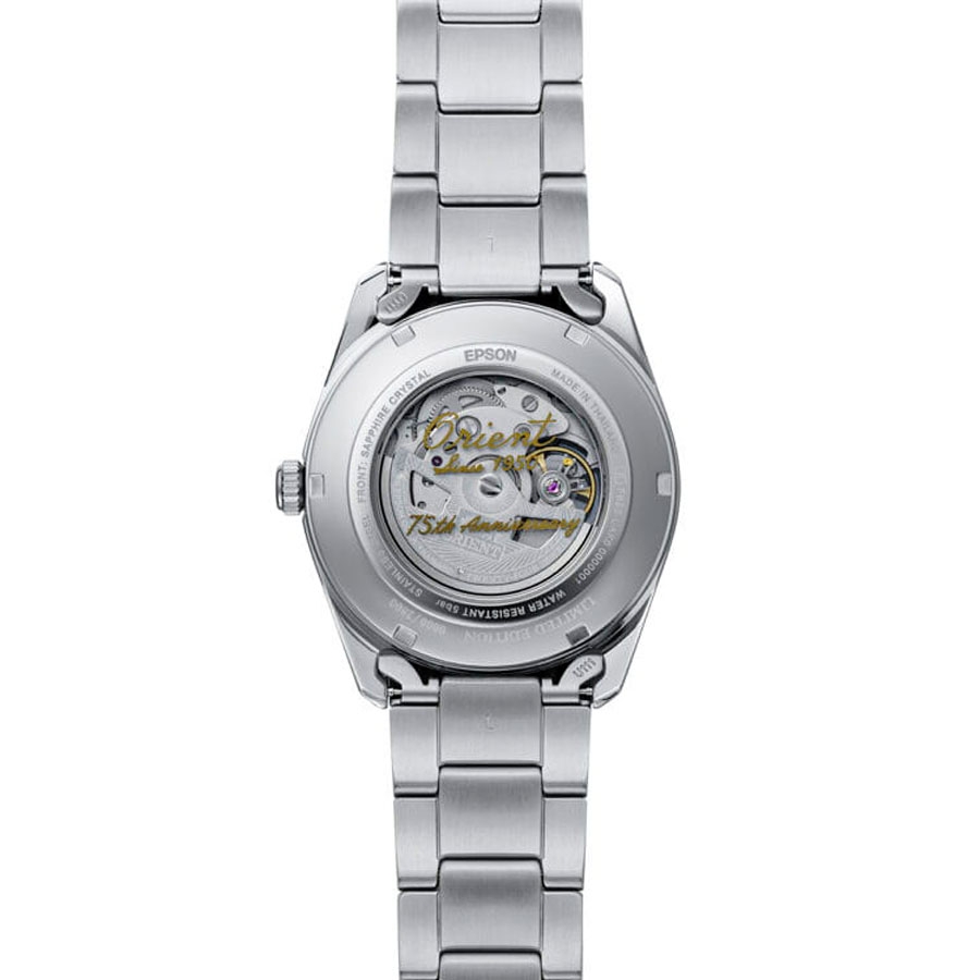 Stretto 75th Anniversary. Лимитированная серия — 2800 экземпляров. Модель посвящена 75-летию компании Orient. Запас хода 40 часов. Возможность ручного завода. Функция stop-second. Защищены от магнитных полей (до 4800 А/м). Циферблат выполнен по технологии Sunray (солнечные лучи) и защищен прочным сапфировым стеклом. Метки в виде штрихов. Рифленая заводная головка. Прозрачная завинчивающаяся задняя крышка. Надежный стальной браслет с раскладывающейся застежкой.