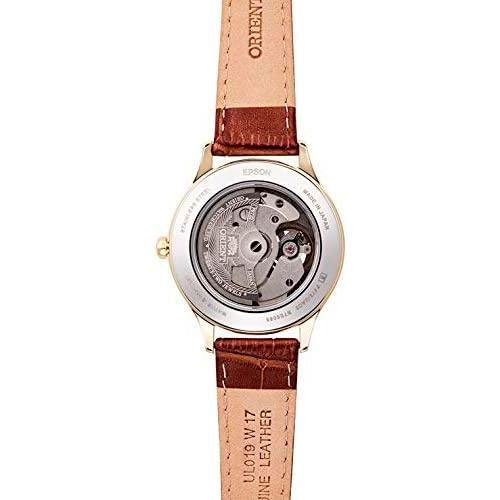 Женские механические часы с автоподзаводом Orient RN-AG0728S на коричневом из натуральной кожи ремне с текстурой под крокодила. Круглый корпус с прозрачной задней крышкой и частично открытым циферблатом, можно наблюдать за работой баланса. Выпуклое минеральное стекло, белый циферблат с хорошо просматриваемой минутной разметкой.