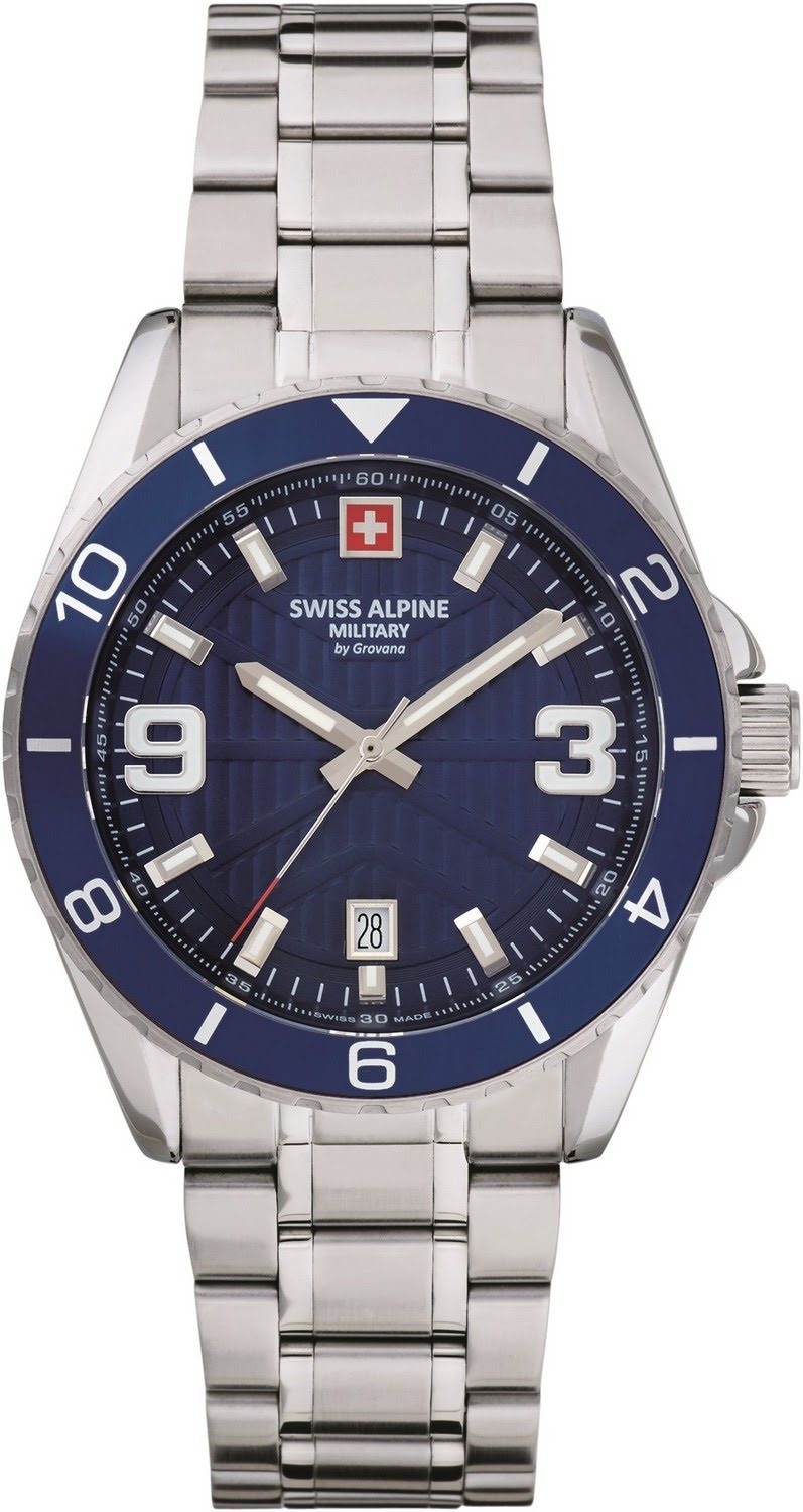 Мужские кварцевые часы в спортивном стиле. Коллекция Sentinel. Синий циферблат с геометрическим гильоше, накладными индексами, крупными арабскими цифрами «3» и «9», апертурой даты на «6 часах». Люминесцентный состав на элементах индикации. Широкий рифленый безель с дублирующими часовыми метками, 42-мм корпус и интегрированный браслет из нержавеющей стали.