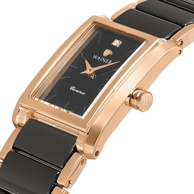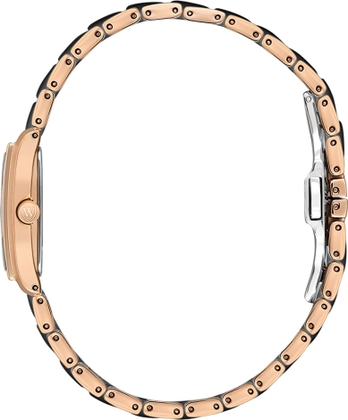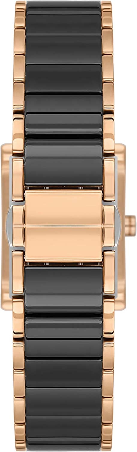 Женские наручные часы. Прямоугольный стальной корпус. Циферблат с метками в виде штрихов и кристаллом в положении 12 часов. Заводная головка украшена фирменным логотипом. Браслет с раскладывающейся застежкой.