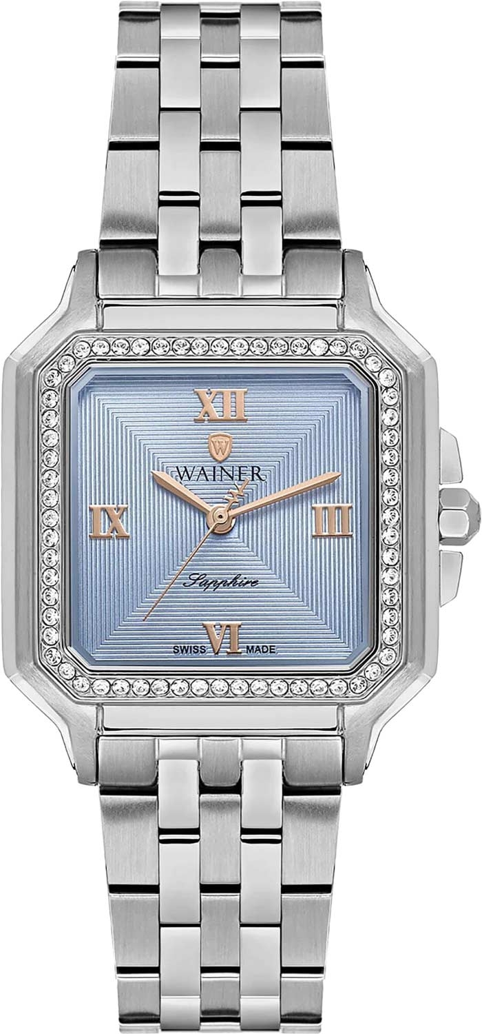 Женские наручные часы. Квадратный стальной корпус. Безель инкрустирован кристаллами. Гильошированный циферблат с метками в виде римских цифр. Секундная стрелка на конце декорирована буквой W. Граненая заводная головка с защитой украшена фирменным логотипом. Браслет с раскладывающейся застежкой.