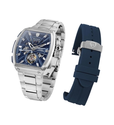 Мужские механические часы-скелетон с автоподзаводом. Запас хода 72 часа. Бочкообразный корпус из нержавеющей стали 316L. Циферблат защищен устойчивым к царапинам сапфировым стеклом. Метки в виде штрихов. Рифленая заводная головка с защитой. Прозрачная задняя крышка. Стальной браслет. В комплекте сменный силиконовый ремешок.