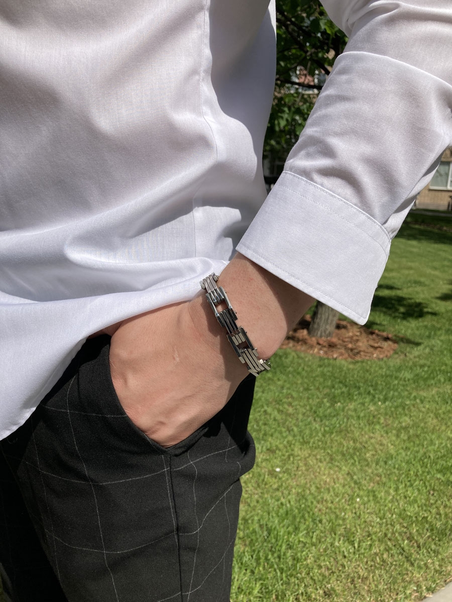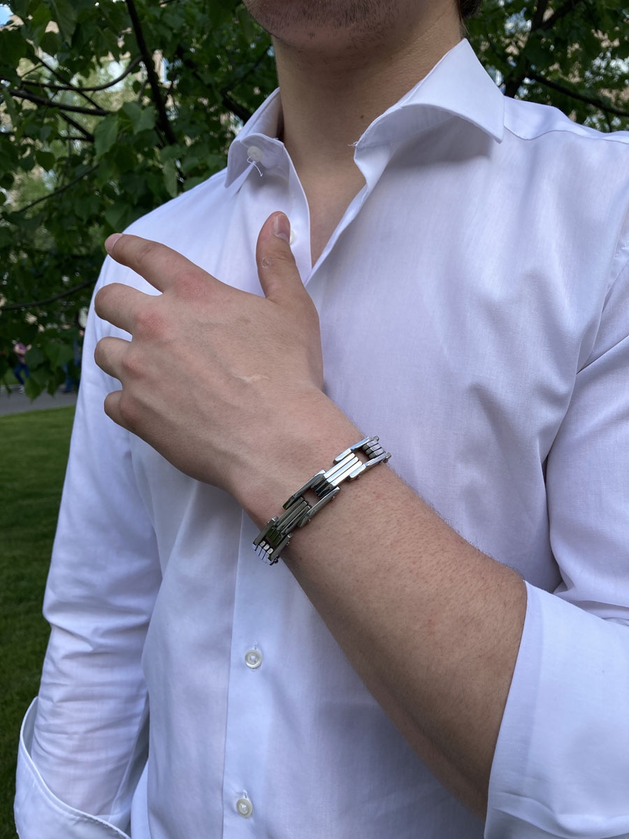 Стильный браслет из гипоаллергенной нержавеющей стали, который одинаково хорошо смотрится как самостоятельный аксессуар, так и в составе сета из браслетов или в сочетании с часами. Удобная в использовании застежка дополняет необычное плетение звеньев и надежно удерживает браслет на запястье.